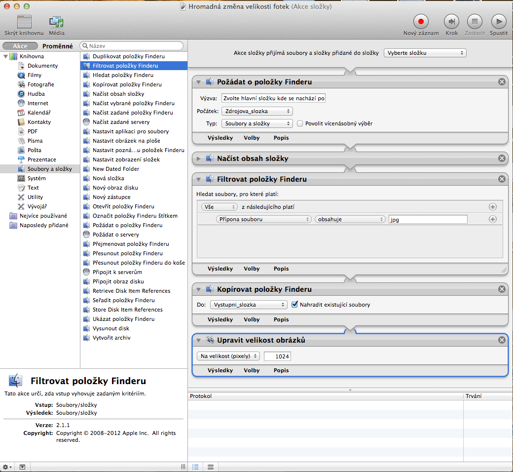Dnes jsem poprvé okusil sílu Automatoru v OS X, kde si člověk dokáže sestavit pomocí posloupně logicky definovaných příkazů požadovaný skript, který vykoná určitou činnost. Hledal jsem na internetu prográmek, který dokáže zmenšit velikost fotek na požadovanou velikost ve všech podsložkách. Našlo se jich mnoho, ale zaujala mě možnost provést tuto akci přes Automator, o kterém jsem věděl jen to, že je součástí OS X.